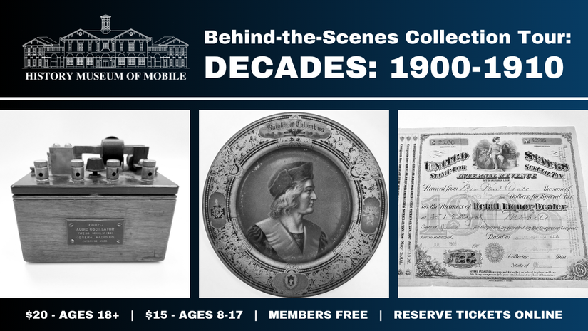 The theme for this month's tour is DECADES: 1900-1910. Begin a trip through the 20th century by focusing on the first decade. Visitors will see textiles, documents, technology, and more that helped shape this transformative time in Mobile history!