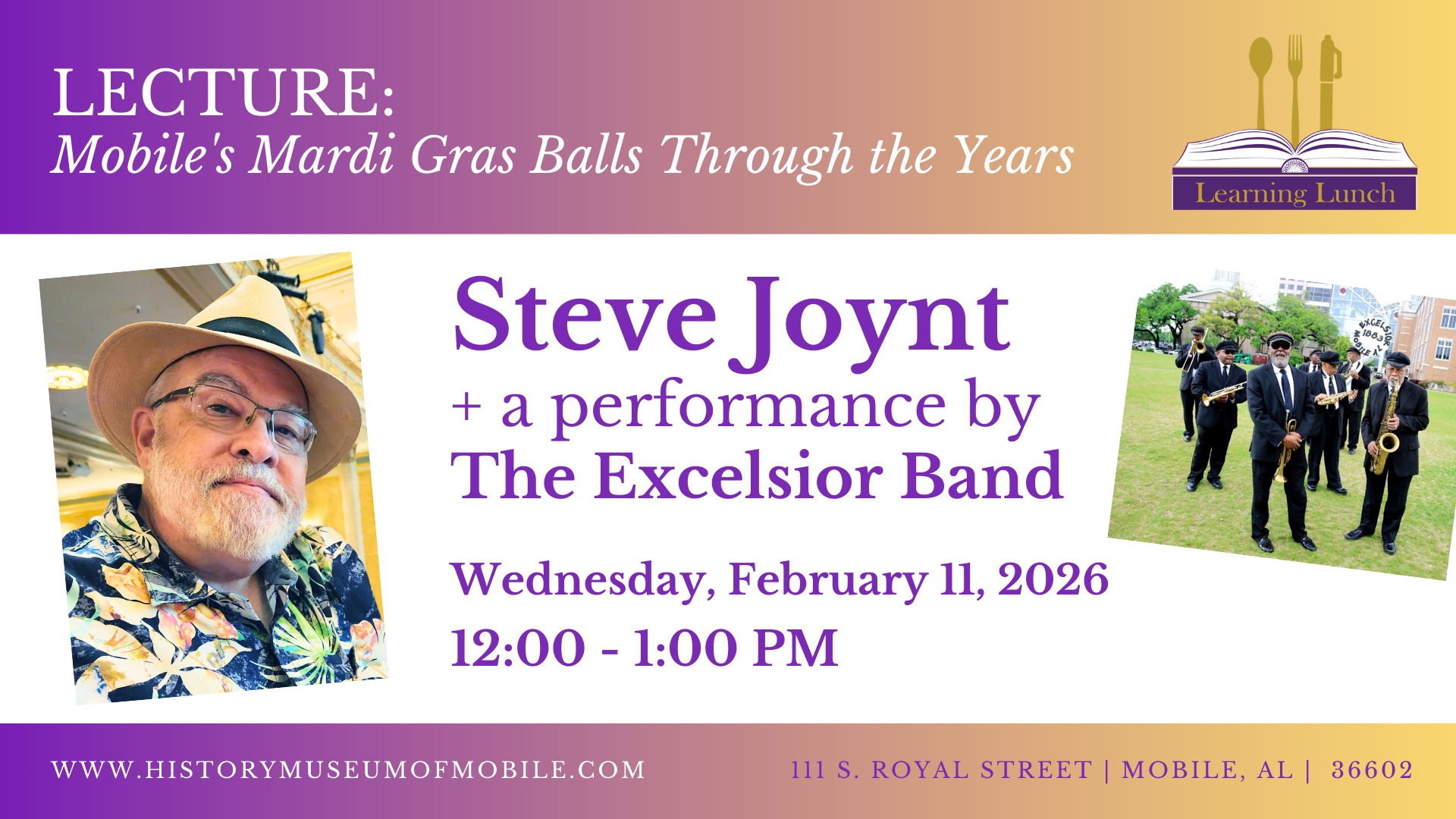 The History Museum of Mobile’s upcoming Learning Lunch Program is on Wednesday, February 11th at 12 PM and will feature Steve Joynt, former professional journalist, and founder of Mobile Mask, as well as a performance by the legendary Excelsion Band. The title of his presentation is Mobile's Mardi Gras Balls Through the Years.