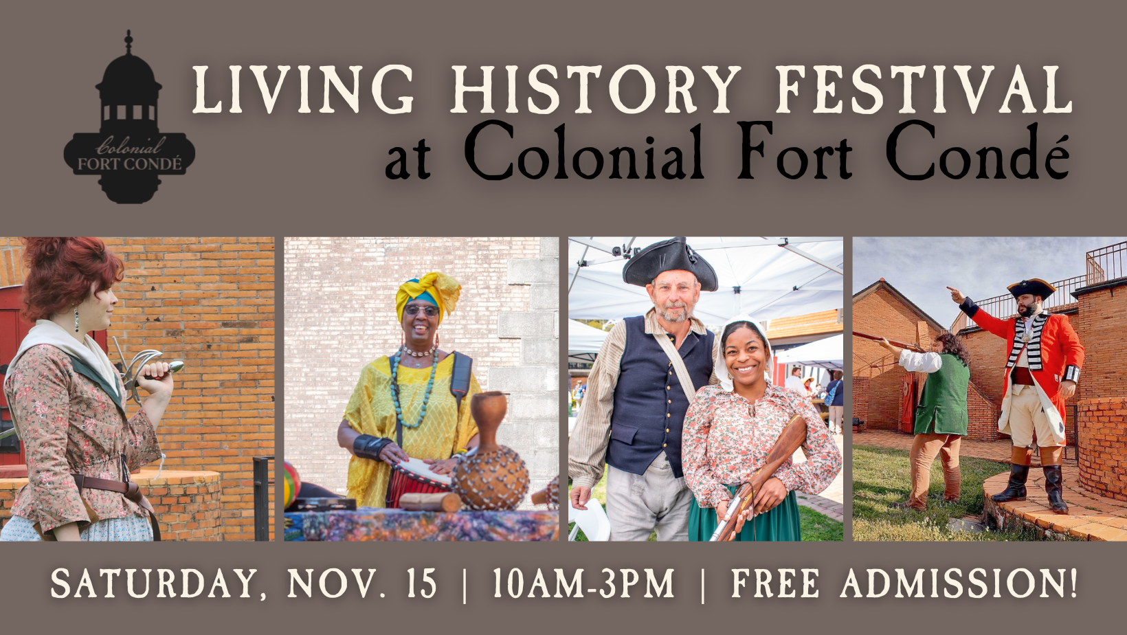 Admission to this event at Colonial Fort Condé is FREE. (Note: Admission to the History Museum of Mobile is separate if you wish to visit those exhibits.) In the event of inclement weather, the activities will be moved indoors.