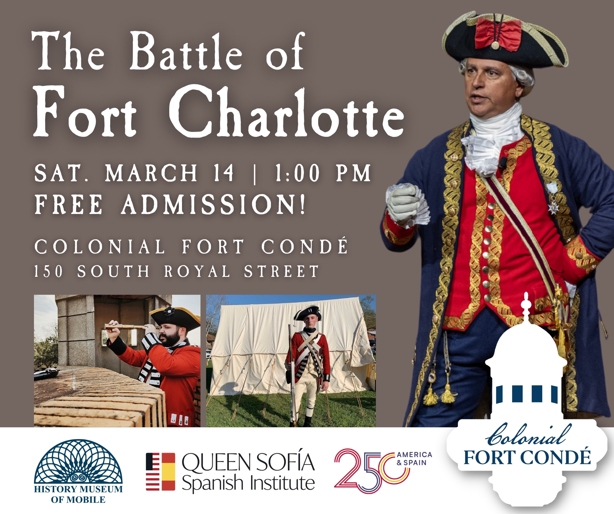 Colonial Fort Condé, in collaboration with the Queen Sofia Spanish Institute, is proud to present “The Battle of Fort Charlotte”! In recognition of the only battle from the American Revolution to occur in Mobile, we invite guests to partake in a unique living history event about the battle between Great Britain and Spain for control of Mobile.